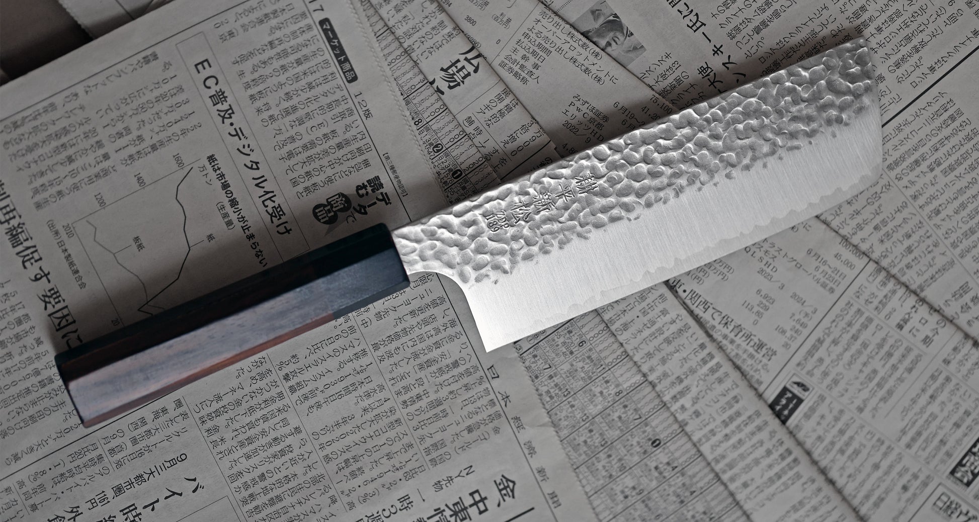 Nakiri is a traditional Japanese knife with a square, thin blade and a deep, flat belly. Since the entire flat edge of the knife touches the cutting board at once, in one clean, vertical movement, there is no need for a horizontal pull or push. This also means that you won’t be turning the vegetable into an “accordion” of pieces still clinging together by a thread. Due to its characteristics, it’s mostly intended to be used for chopping veg, but you can still use it as a good all-rounder in the kitchen.