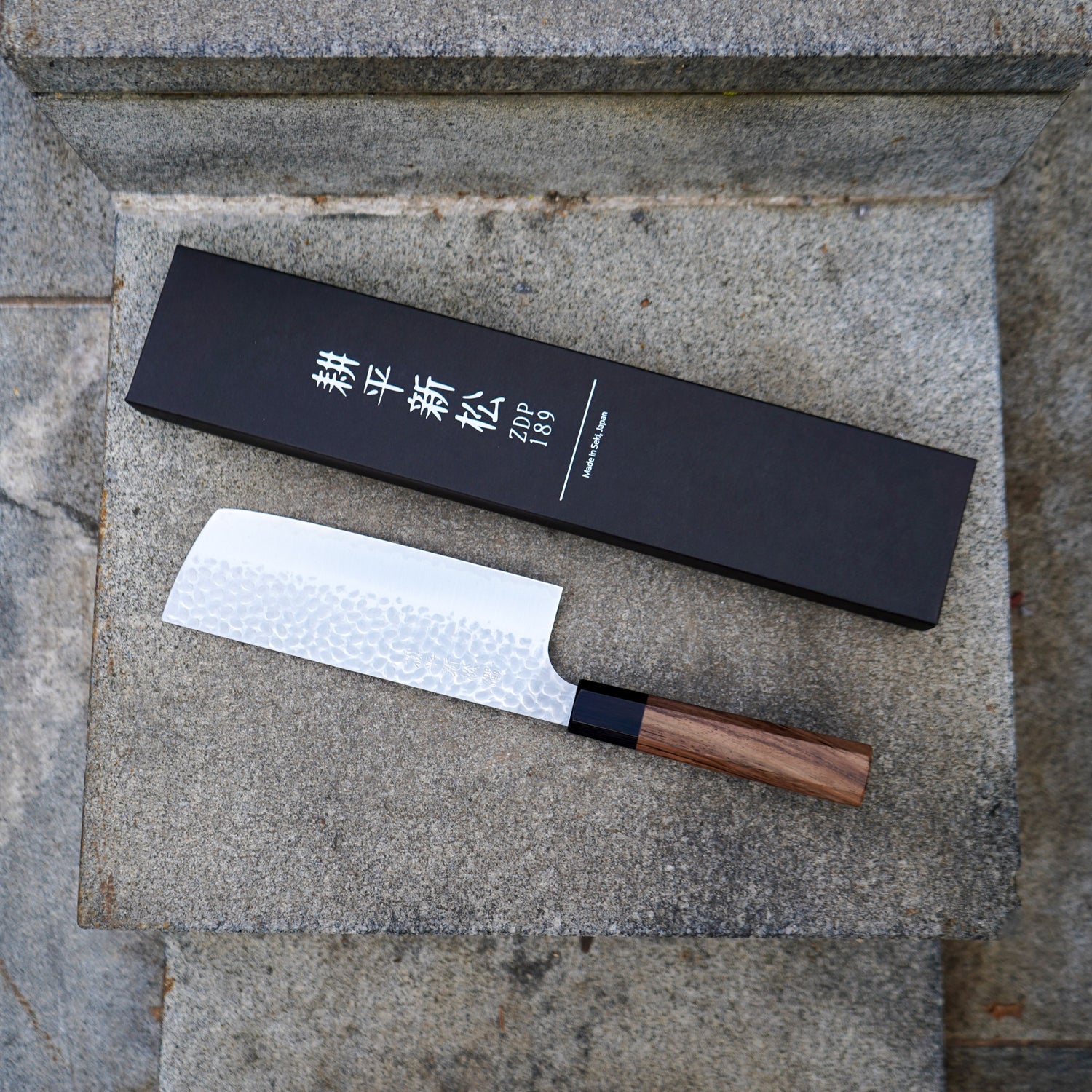 This knife was forged out of ZDP-189 steel, which falls into the powder steel category. The ZDP-189 steel has gained a reputation as one of the most technologically advanced steels in Japanese knife making, due to its unique characteristics. The carbon (C) content is around 3%, meaning it can be treated to extreme hardness (65-66 HRC), which results in extended sharpness retention. ZDP-189 steel is also highly corrosion resistant due to its high chromium (Cr) content of 20%. Because of its composition, though, it can be hard to treat and forge, so it can only be trusted to the most experienced blacksmiths.