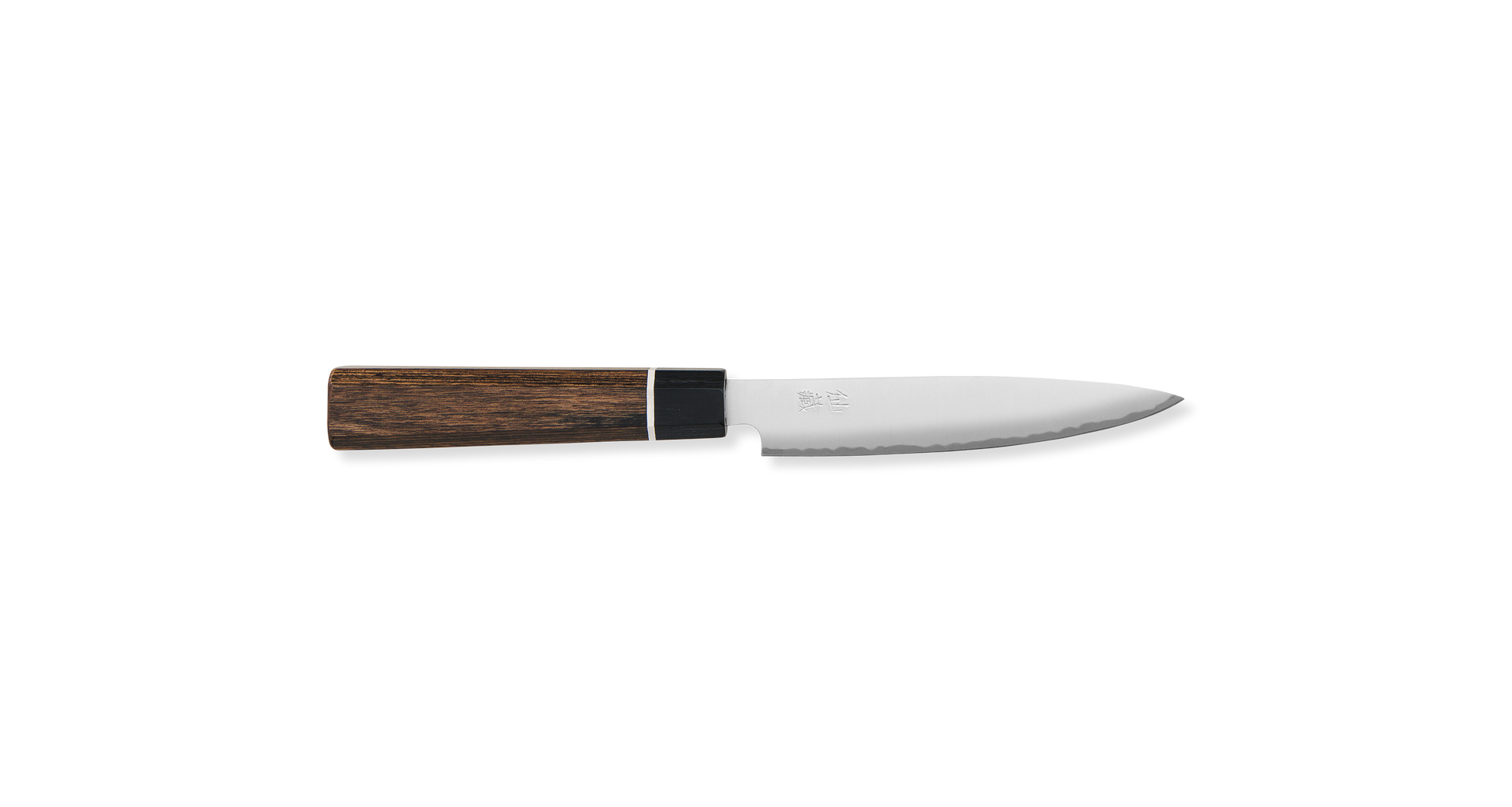 The knife features a matte, unpolished finish with a very pronounced line at the bottom of the blade. Forged with a common “sandwich” method calledsan-mai, this line indicates the border between the two softer, outer layers of steel, and the strong SG2 core steel, seen exposed at the very edge of the blade. We simply love its shape and narrow profile and therefore recommend it to everyone who can appreciate superior sharpness.